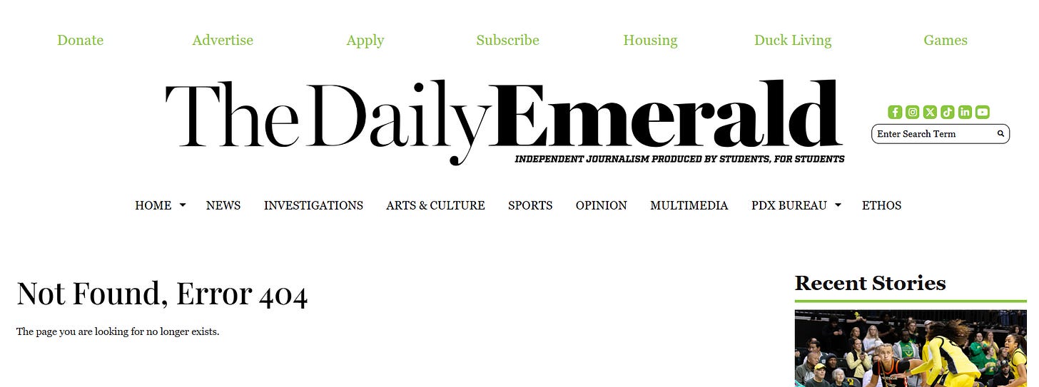 Yesterday, a friend and reader sent over this link to a story at The Daily Emerald, the student paper at the University of Oregon. Today, the story is gone. And I think — I hope — this is good news.